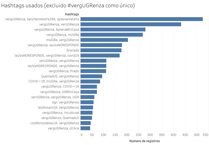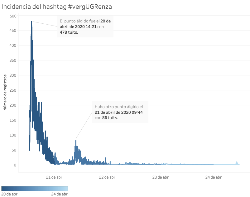 Mucha de la actividad principal se centró en retuits de contenido relativo a la etiqueta: de los 89.576 registros recogidos, 13.789 (15,4%) eran tuits originales, 1.401 (1,6%), citas de tuits y 74.386 (el restante 83%), retuits de esos tuits. La mayoría de ellos situados en Granada, según los perfiles de los tuiteros participantes (aunque la localización geográfica es voluntaria y no muy usada, por lo que no es una variable a tener demasiado en cuenta). Y, es curioso, el hashtag #vergUGRenza como hashtag único se usaba en el 90% de las veces, pero en el otro 10% se usaba en combinación con otros hashtags usados en días anteriores para quejarse de otras Universidades, como las de Sevilla (QuemadUS), Valladolid (laUVaNORESPONDE) o Cádiz (UCAca) o, el colmo, con las etiquetas políticas SanchezVeteYA o IglesiasVeteYA.