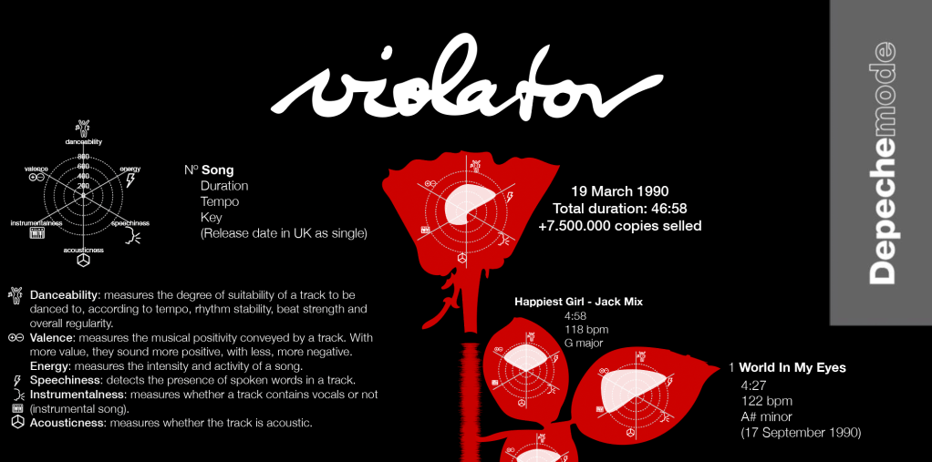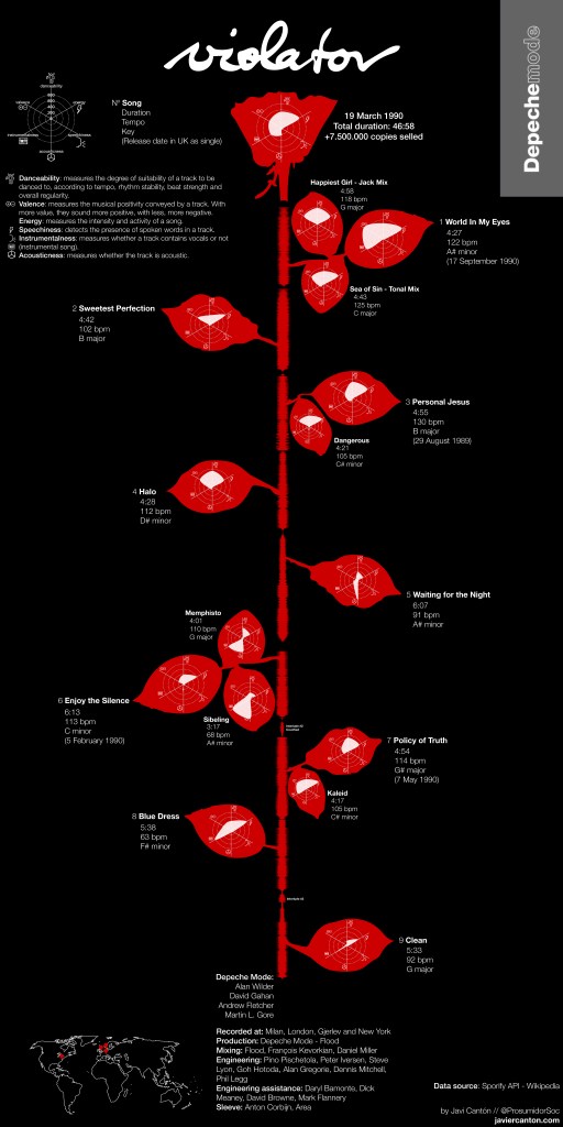I really wanted to dedicate some time to make a static dataviz, one in which I could apply everything I have learned over the years in terms of data visualization. I love data visualizations that have to do with music, so what better than starting with a visualization of the band that has most marked me personally: Depeche Mode. I wanted it to be a well-known album and, although it is not my favorite of all their discography, I chose Violator, released in 1990, because it was probably the album they sold the most copies of and the one that definitively established them worldwide, after their growing success in the 80s. It has been a visualization made in Illustrator, with the help of other tools like R, Flourish or WaveFormer, I hope you like it!