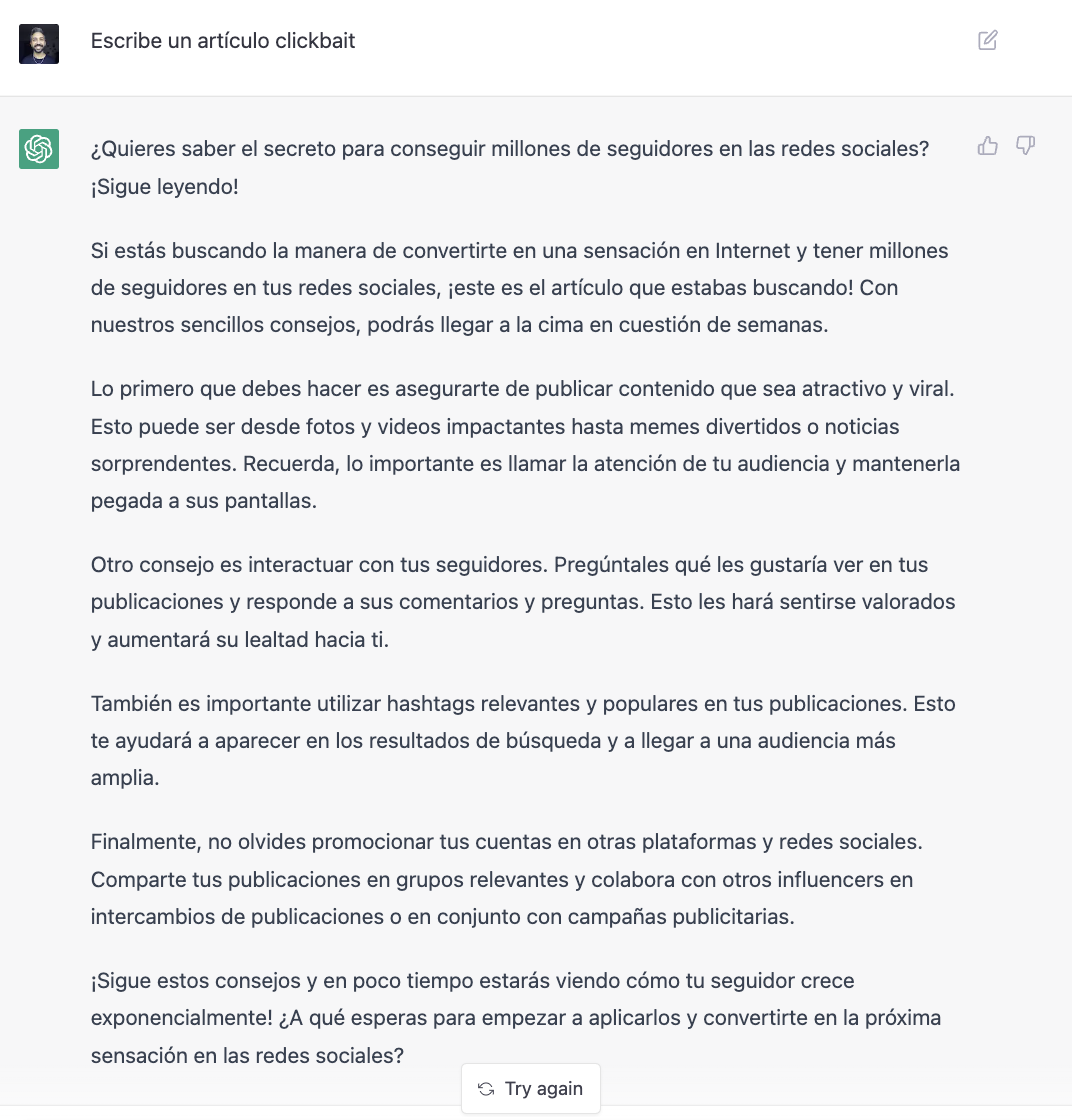 [Actualización: corrijo, una IA como ChatGPT ya es capaz de hacer artículos clickbait en menos de 10 segundos de más calidad que los hechos por humanos]
