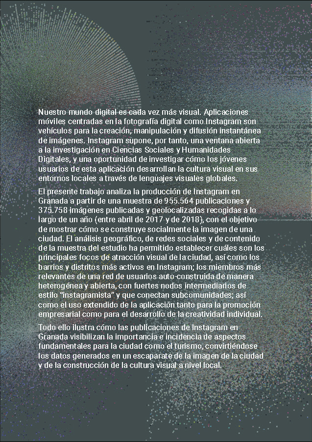 This study analyzes Instagram production in Granada based on a sample of 955,564 posts and 375,758 geolocated images collected over a year (from April 2017 to April 2018), aiming to show how the image of a city is socially constructed. The geographic, social network, and content analysis of the study sample has helped identify the main visual attraction points in the city, the most active neighborhoods and districts on Instagram, and the most relevant members of a self-constructed, heterogeneous, and open user network, featuring strong intermediary nodes with an “Instagrammer” style that connect sub-communities. Additionally, the study highlights the widespread use of the application for both business promotion and individual creativity development.